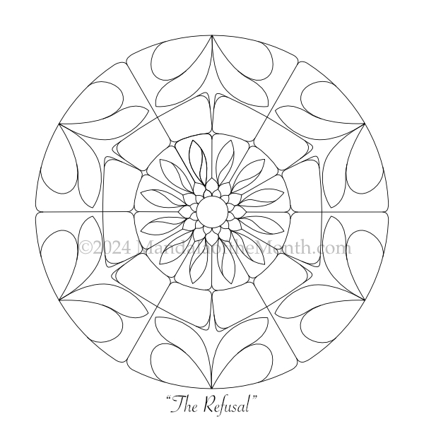 I’ll be coloring this mandala once a week throughout the month, as a way to address “the refusal” in the different areas of my life that I wrote about for Step 1 (health, home, “The Mandala Lady”, and my purpose). I’ll be posting my colorings along with “my refusals” at the MandalaoftheWeek.com.